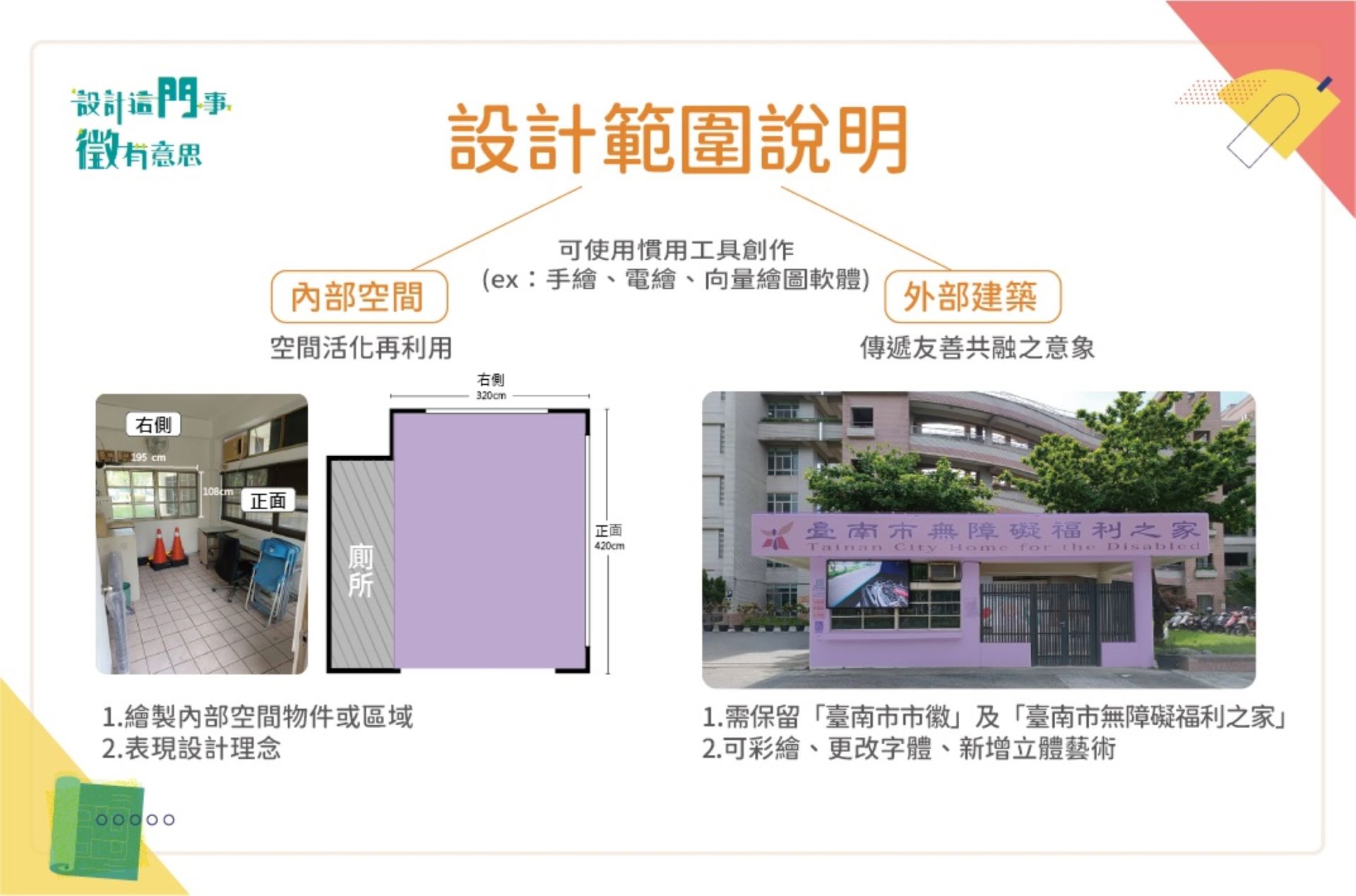 為推動公共空間友善設計,深化社會共融理念,臺南市政府社會局辦理「臺南市無障礙福利之家入口意象設計徵選活動」,即日起至115年2月25日止開放報名,廣邀對設計創作、公共議題、身心障礙權益保障與社會福利相關議題有興趣的民眾踴躍參與,透過創意發想,提出對友善空間的想像與回應。